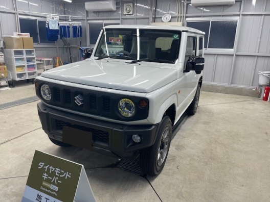 | 担当者コメント | 新車ジムニー「ダイヤモンドキーパープレミアム」施工しました! ボディの他、樹脂パーツ・ライト・窓ガラス・ホイール等、細部にわたってコーティングする高級コーティングです♪ 新車でキレイですが、さらに輝いて見えます! 施工ありがとうございました! |